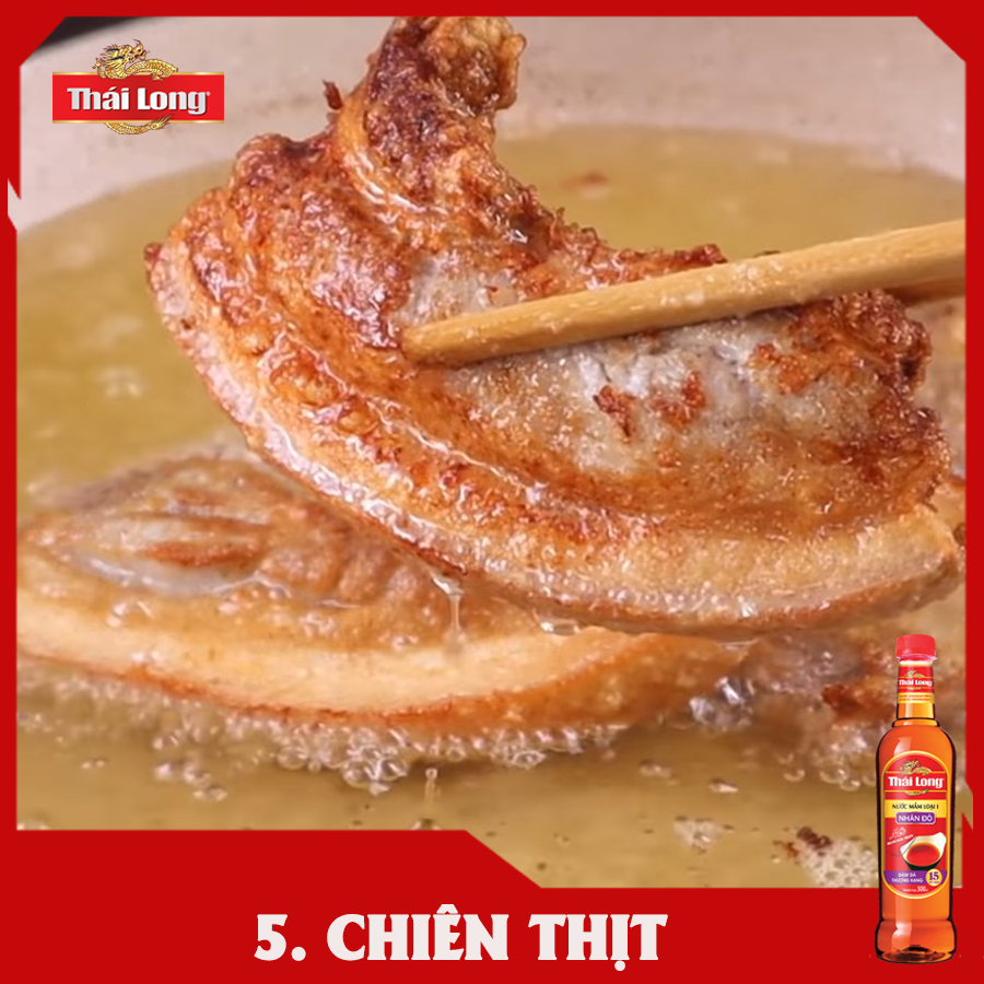 Thịt ba rọi chiên nước mắm có lớp vỏ vàng ươm, giòn rụm vị bùi béo, nước sốt đậm đà với hương vị mặn ngọt. Món ăn sẽ càng thơm ngon hơn khi dùng kèm với cơm trắng và nước mắm Thái Long đấy!