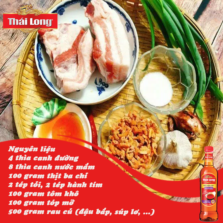 Thịt ba chỉ sau khi đã cắt hạt lựu thì cho một ít dầu vào chảo, cho 100 gram thịt ba chỉ và đảo đều cho tới khi thịt teo lại thành tóp mỡ. Sau khi thấy tốp mỡ vàng giòn thì tắt bếp và để riêngCho ít một ít dầu vào chảo và khử hành tím, tỏi cho thơm. Sau đó cho tôm khô vào đảo đều cho tới khi dậy mùi thơm. Cho tiếp phần tốp mỡ vào và nấu với hỗn hợp nước mắm pha trong lửa nhỏ.