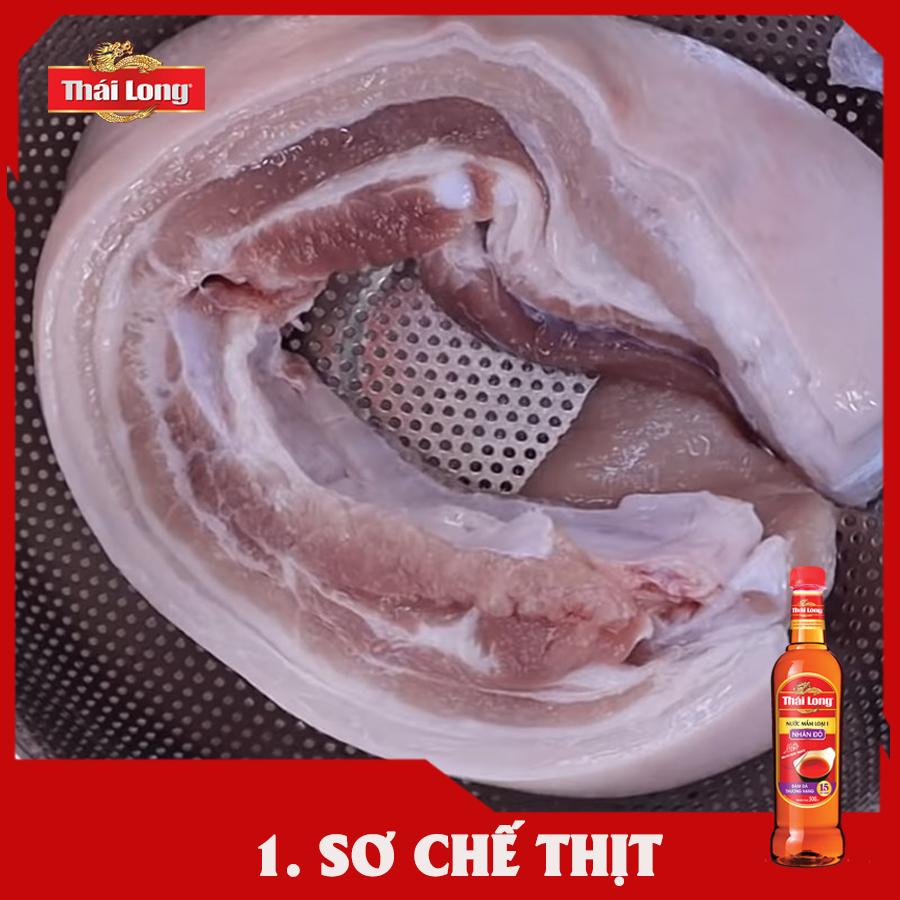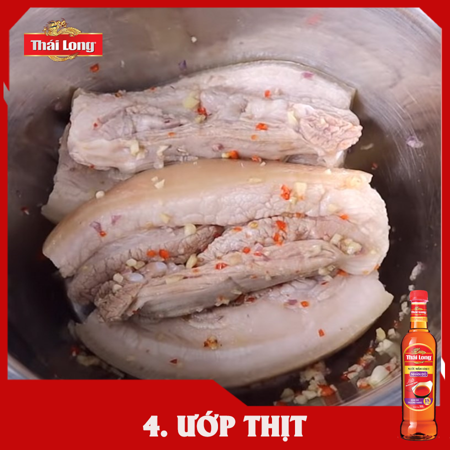 Cho vào tô lớn phần thịt heo đã luộc, 1/2 muỗng canh hạt nêm, 1/2 muỗng cà phê đường, 1/2 muỗng canh nước mắm, 1 muỗng cà phê hỗn hợp hành tím, tỏi và ớt băm nhuyễn và trộn đều.Ướp thịt trong 20 phút.
