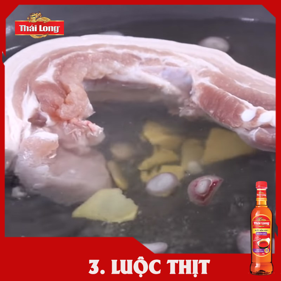 Bắc một nồi nước lên bếp, cho vào gừng cắt lát, 2 củ hành tím cắt lát, 1 muỗng cà phê muối sau đó luộc thịt heo trong 5 phút.Vớt thịt heo ra, dùng dao khứa nhiều đường lên phần da, sau đó để ráo nước. Cách này giúp da khi chiên sẽ giòn và phồng hơn.