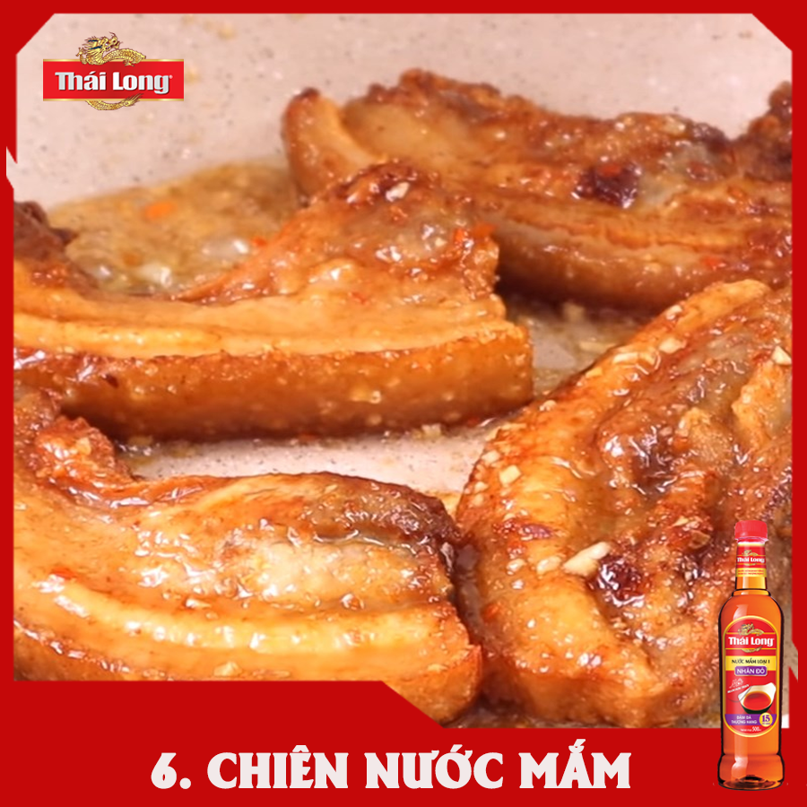 Thịt ba rọi chiên nước mắm có lớp vỏ vàng ươm, giòn rụm vị bùi béo, nước sốt đậm đà với hương vị mặn ngọt. Món ăn sẽ càng thơm ngon hơn khi dùng kèm với cơm trắng và nước mắm Thái Long đấy!