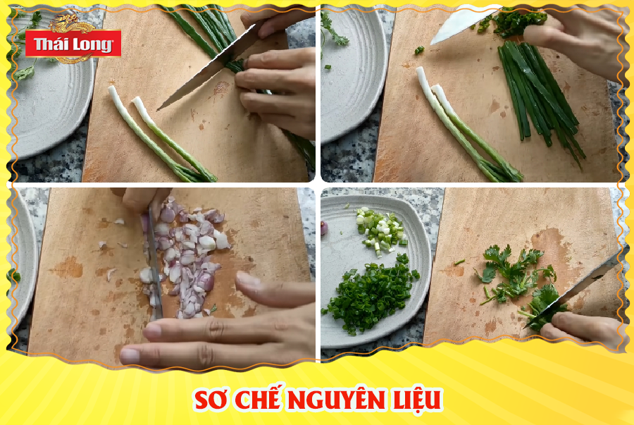 Hành lá, hành tím, rau mùi đem đi rửa sạch. Sau đó, cắt đôi và chia thành hai phần là đầu hành và lá hành, sau đó thái nhỏ. Còn hành tím và rau mùi cũng thái thật nhỏ đặt sang bên cạnh.