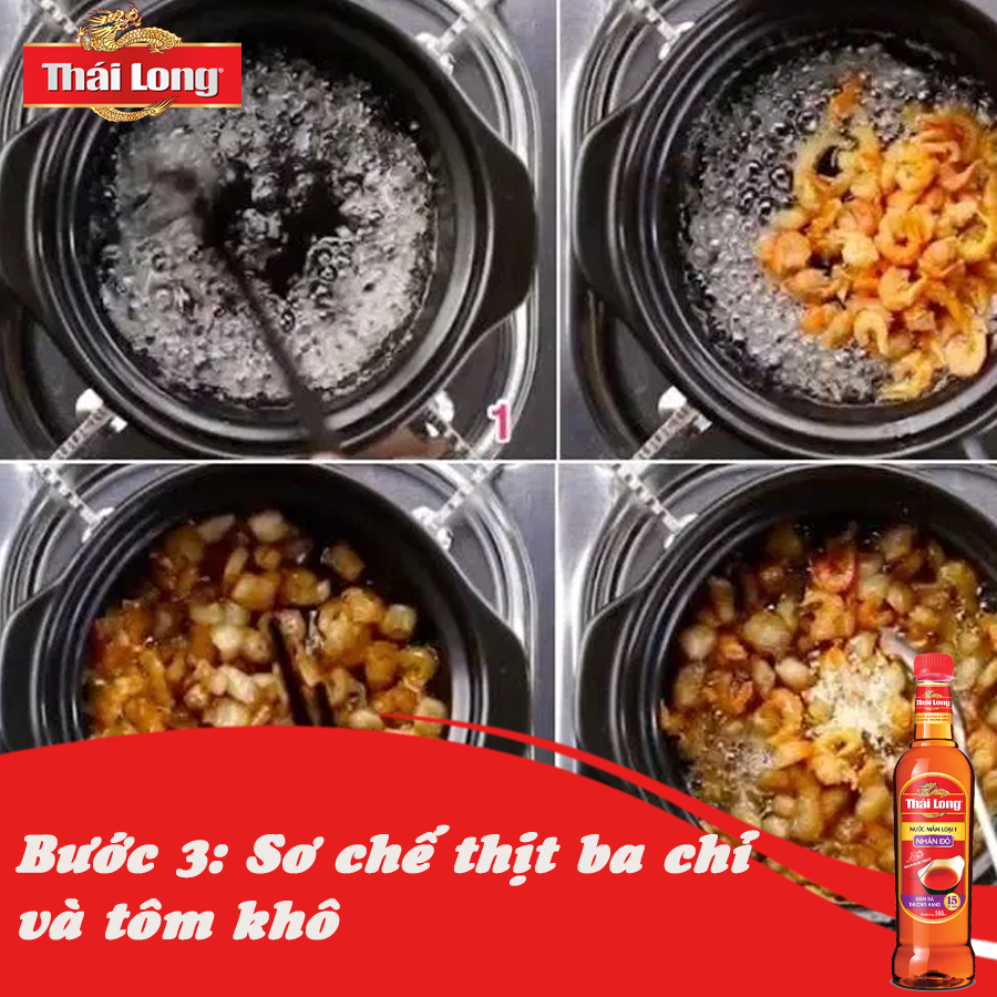 Thịt ba chỉ sau khi đã cắt hạt lựu thì cho một ít dầu vào chảo, cho 100 gram thịt ba chỉ và đảo đều cho tới khi thịt teo lại thành tóp mỡ. Sau khi thấy tốp mỡ vàng giòn thì tắt bếp và để riêngCho ít một ít dầu vào chảo và khử hành tím, tỏi cho thơm. Sau đó cho tôm khô vào đảo đều cho tới khi dậy mùi thơm. Cho tiếp phần tốp mỡ vào và nấu với hỗn hợp nước mắm pha trong lửa nhỏ.