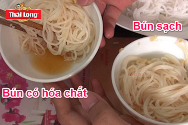 Cách thử khá đơn giản: Đầu tiên, cho một lượng bún vào chén chứa lượng nước mắm rồi trộn đều lên. Nếu là bún sạch thì nước mắm sẽ ngấm vào sợi bún nhanh hơn khiến sợi bún mềm ra. Còn sợi bún được tẩm hóa chất sẽ ngấm rất ít và ngấm lâu hơn, sợi bún khô và có dấu hiệu rời ra vì chứa nhiều hàn the - hóa chất để bảo quản sợi bún.