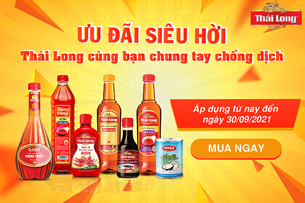 - Giảm giá từ 10 đến 20% cho sản phẩm: Nước chấm Rồng Vàng, Ngon ngon, nước tương, tương ớt Thái Long, nước cốt dừa Opera. Riêng hệ thống BigC, giảm đến 30% từ 28/8 đến 8/9/2021 đối với nước mắm Thái Long Nhãn Đỏ Loại I - 750ml