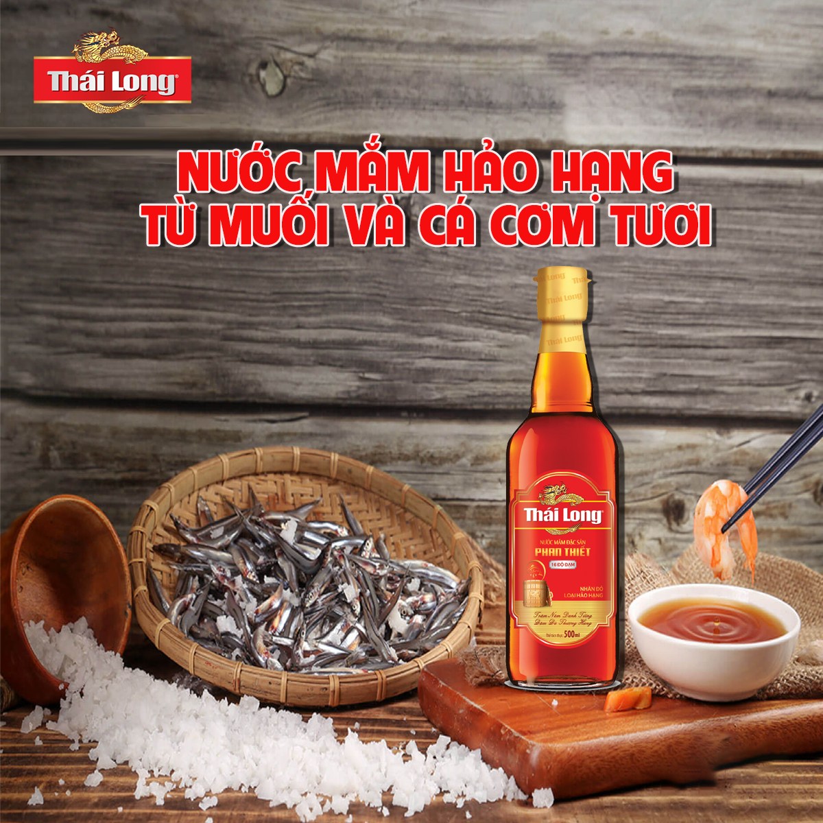 Nước mắm Thái Long được làm từ cá cơm tươi tuyển chọn, ủ chượp cùng muối tinh khiết theo tỉ lệ 3:1 mang lại hương vị nước mắm đậm đà, thơm ngon, đặc trưng của vùng biển Phan Thiết.
